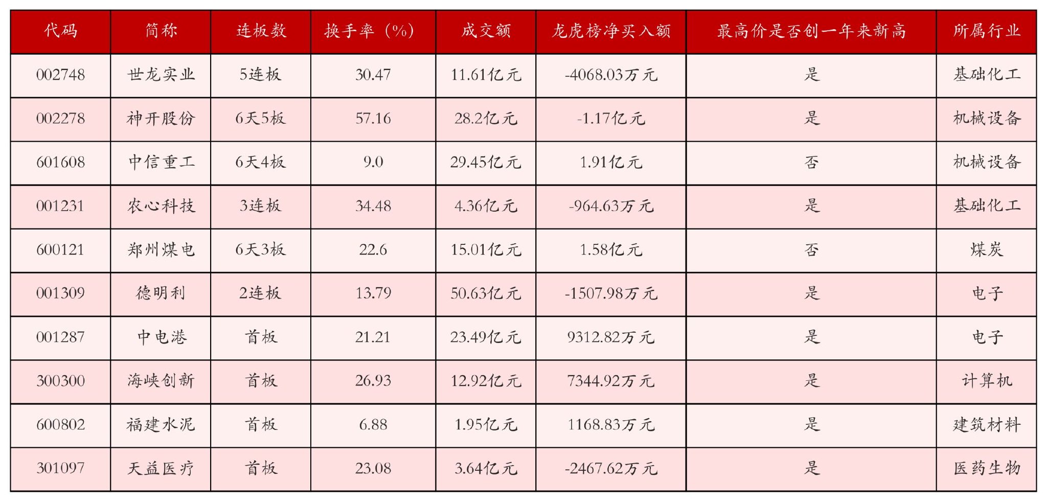 截至10月27日收盘,上证综指上涨1.18%,收于3996.94点,深证成指上涨1.51%,收于13489.4点,创业板指上涨1.98%,收于3234.45点。今日沪深两市A股共计64只涨停,综合当前连板数以及当日龙虎榜数据,其中较为强势的前三只个股分别为:世龙实业(维权)(002748)、神开股份(002278)与中信重工(601608)。今日强势个股前10位具体数据见下表: