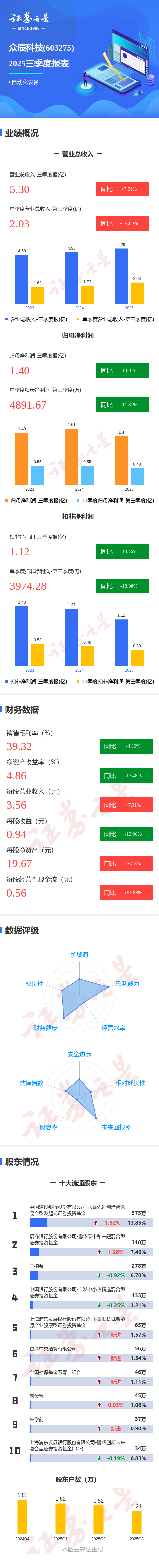 证券之星消息,众辰科技2025年三季报显示,公司主营收入5.3亿元,同比上升7.32%;归母净利润1.4亿元,同比下降13.01%;扣非净利润1.12亿元,同比下降18.16%;其中2025年第三季度,公司单季度主营收入2.03亿元,同比上升16.8%;单季度归母净利润4891.67万元,同比下降11.82%;单季度扣非净利润3974.28万元,同比下降18.08%;负债率11.19%,投资收益402.96万元,财务费用-1055.85万元,毛利率39.32%。