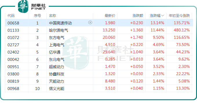 截至收盘,中国高速传动(00658.HK)大涨13.14%,哈尔滨电气(01133.HK)涨11.44%,东方电气(01072.HK)涨9.5%,上海电气(02727.HK)涨4.69%,亿华通(02402.HK)涨3.64%,协鑫科技(03800.HK)等跟涨。