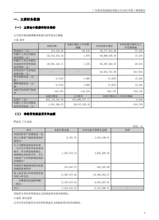 10月23日,ST泉为(300716)发布2025年三季报显示,2025年1-9月公司实现营收4677万元,同比下滑-77.24%;归属于上市公司股东的净利润-5880万元,同比增长15.31%;属于上市公司股东的扣除非经常性损益 的净利润-5659万元,同比增长20.01%;其中,2025年第三季度实现营收573,343.56元,同比下滑99.04%;归母净利润-2201万元,同比增1.87%;扣非后净利润-2060万元,同比增1.25%。