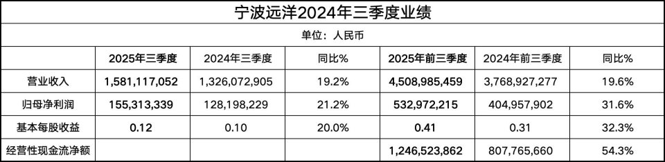 具体而言,2025年第三季度,宁波远洋实现营业收入15.81亿元,同比增长19.23%;归属于上市公司股东的净利润为1.55亿元,同比增长21.15%;基本每股收益0.12元。