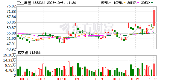 10月31日盘中科创板股三生国健涨停,截至10:33,股价报72.96元,成交7.36亿元,换手率1.73%,振幅21.40%。