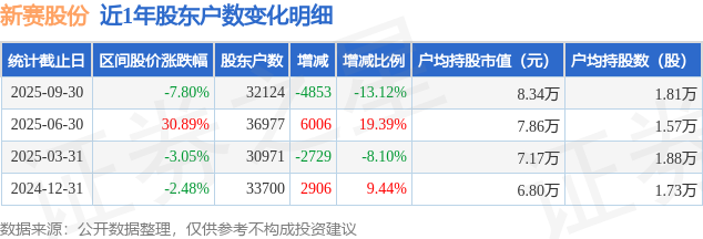 从股价来看,2025年6月30日至2025年9月30日,新赛股份区间跌幅为7.8%,在此期间股东户数减少4853.0户,减幅为13.12%。
