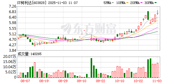 ST柯利达(维权)再度涨停,9个交易日内录得6个涨停,累计涨幅为27.29%,累计换手率为17.35%。截至9:46,该股今日成交量762.32万股,成交金额5197.33万元,换手率1.28%。最新A股总市值达41.42亿元,A股流通市值41.42亿元。