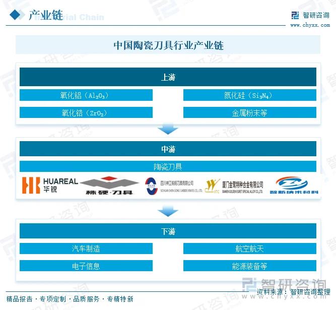 陶瓷刀具行业上游主要包括氧化铝(Al₂O₃)、氮化硅(Si₃N₄)、氧化锆(ZrO₂)等陶瓷粉体以及金属粉末、添加剂等原材料供应商和生产设备供应商;行业中游为陶瓷刀具生产制造环节;行业下游为应用市场,涵盖汽车制造、航空航天、电子信息、能源装备等工业领域以及家庭厨房等民用领域。