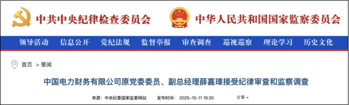 近日,中国电力财务公司原党委委员、副总经理薛嘉璋涉嫌严重违纪违法,接受中央纪委国家监委驻国家电网有限公司纪检监察组纪律审查和甘肃省定西市监察委员会监察调查。