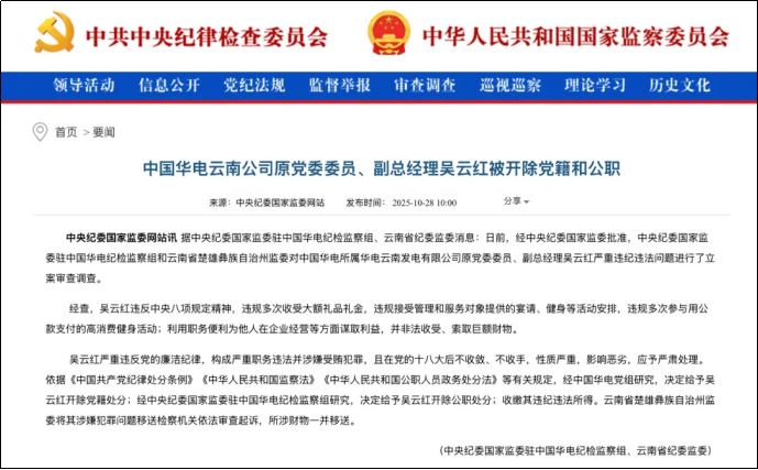 10月28日,中国华电所属华电云南发电有限公司(以下简称“华电云南发电”)原党委委员、副总经理吴云红严重违纪违法被立案审查调查。
