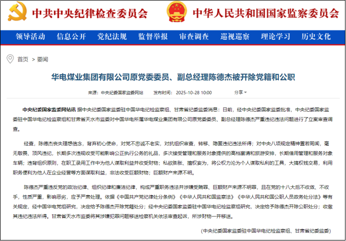 10月28日,中国华电所属华电煤业集团有限公司(以下简称“华电煤业”)原党委委员、副总经理陈德杰涉嫌严重违纪违法被立案审查调查。