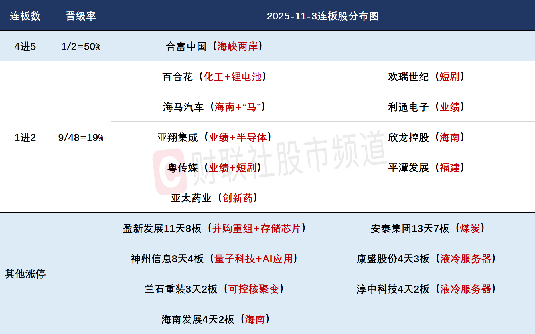 财联社11月3日讯,今日66股涨停,21股炸板,封板率为76%,合富中国5连板,平潭发展12天9板,盈新发展(维权)11天8板,安泰集团13天7板,神州信息8天4板,康盛股份4天3板,粤传媒5天3板。市场探底回升,三大指数全线翻红。沪深两市成交额2.11万亿,较上一个交易日缩量2107亿。盘面上,市场热点快速轮动,全市场超3500只个股上涨。板块方面,海南、游戏、影视院线等板块涨幅居前,电池、有色金属、稀土永磁等板块跌幅居前。截至收盘,沪指涨0.55%,深成指涨0.19%,创业板指涨0.29%。