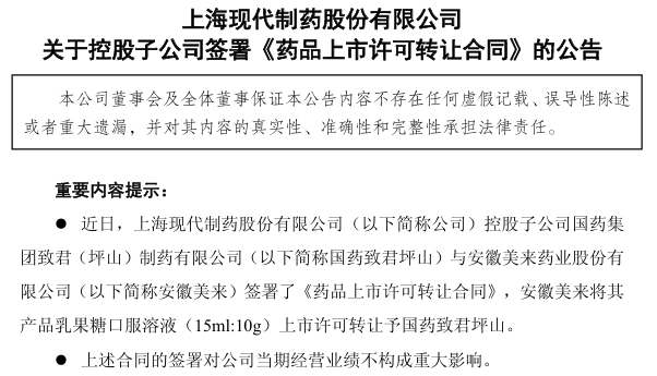 11月4日,国药现代发布公告,其控股子公司国药集团致君(坪山)制药与安徽美来药业签署《药品上市许可转让合同》,安徽美来药业将其产品乳果糖口服溶液(15ml:10g)上市许可转让予国药集团致君(坪山)制药,转让费总计586万元。米内网数据显示,乳果糖口服溶液在2024年中国三大终端六大市场销售额超过20亿元,2025年上半年同比增长1.74%,是治疗便秘化药TOP1产品。