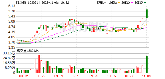 ST华鹏(维权)盘中涨停,已连收6个涨停板,截至9:25,该股报5.88元,换手率0.44%,成交量141.09万股,成交金额829.61万元,涨停板封单金额为2139.14万元。连续涨停期间,该股累计上涨33.94%,累计换手率为12.55%。最新A股总市值达18.81亿元。