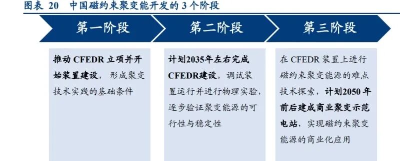 b)CFEDR 项目(示范堆): 我国根据自己的国情,制定了中国磁约束聚变能发展路线:实验装置-实验堆-工程堆、示 范堆-商业堆。 CFEDR 项目目前已升级为示范堆,未来聚变能源商业化有望加速。具体来看: 2021 年:CFETR 开始立项建设; 2025 年 6 月:CFETR 官方名称更新为 CFEDR,标志着该项目定位已从实验堆升级 为示范堆; 2035 年:预计 CFEDR 正式建成,并将调试装置运行、进行大规模物理实验; 2050 年:在 CFEDR 持续进行难点技术探索,并建成商业聚变示范电站。