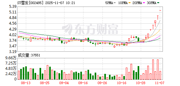 ST雪发盘中涨停,已连收6个涨停板,截至9:25,该股报5.19元,换手率0.30%,成交量163.98万股,成交金额851.06万元,连续涨停期间,该股累计上涨33.76%,累计换手率为5.92%。最新A股总市值达28.23亿元。