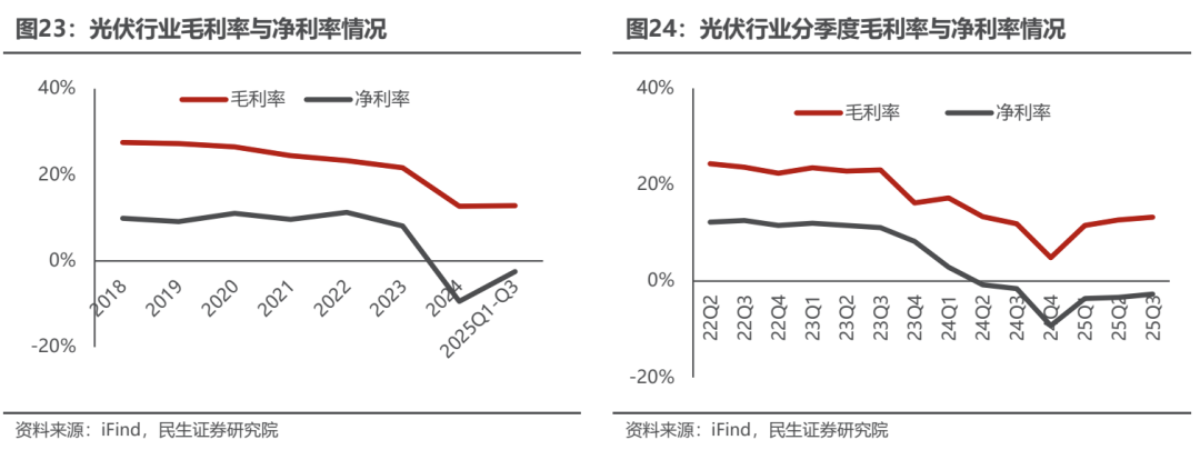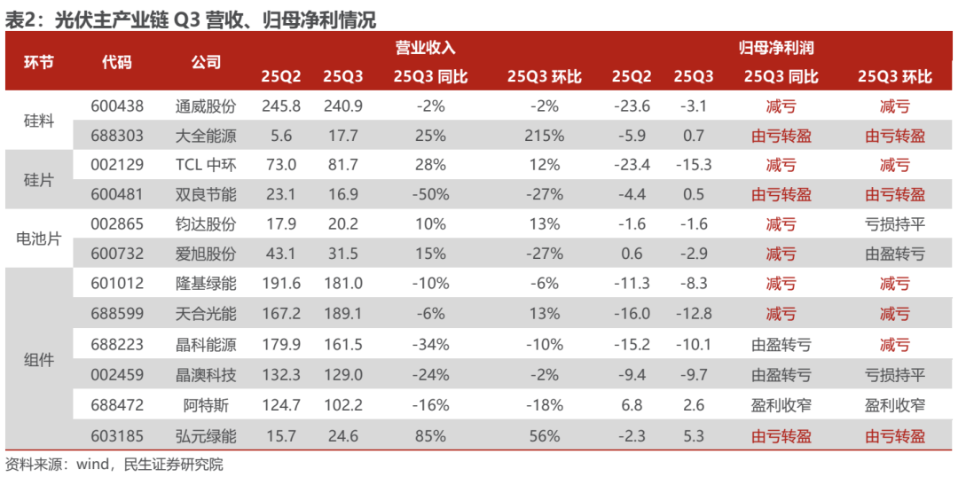 主产业链亏损整体收窄,行业反转再即。由于今年以来有关部门针对“反内卷”持续发声,多晶硅价格6月以来涨势显著,从三季度情况可以看到大全能源、协鑫科技单季度实现盈利,通威股份也实现较大幅度环比减亏,整个主产业链硅料环节减亏幅度相对较大。多晶硅的下游硅片环节盈利也实现显著改善,TCL中环实现同环比减亏,双良节能单季度环比25Q2扭亏为盈。此外,尽管价格传导仍然需要一定时间,但是可以看到部分一体化组件企业在三季度也实现环比减亏。总体来看,Q3光伏主产业链环比有所改善,我们认为,随着行业供给侧改革的持续推进,以及高层对无序价格竞争的加大管控,光伏行业有望迎来触底反弹。