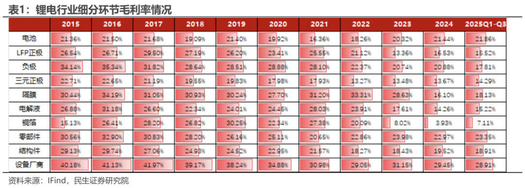 各环节毛利率方面:2025Q1-Q3,设备厂商、零部件、电池分居前三位,分别为28.91%、23.35%、21.86%,毛利率后三位的环节为铜箔、三元正极和电解液,分别为7.11%、14.29%、15.22%。与24年全年相比,铜箔、隔膜盈利能力增长较为显著,毛利率分别增长3.18Pcts/2.03Pcts,负极环节毛利率与24年全年相比下降3.06Pcts。