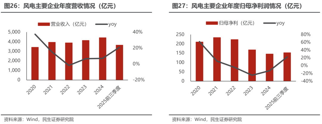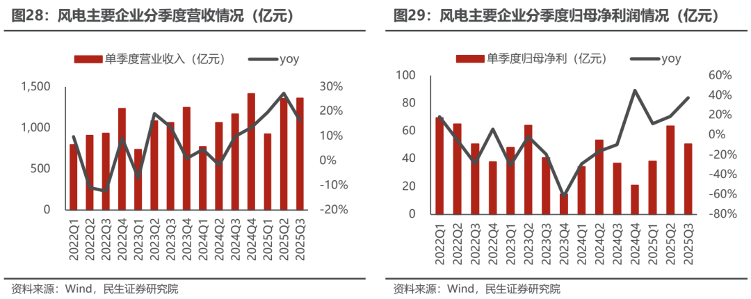 25Q3营收净利实现双增。2025Q3风电行业实现营业收入1360.16亿元,同比增长16.32%;实现归母净利润50.75亿元,同比增长37.37%。2025年三季度行业整体需求预期旺盛,营收净利实现同比双增,部分环节已经实现量利双增。