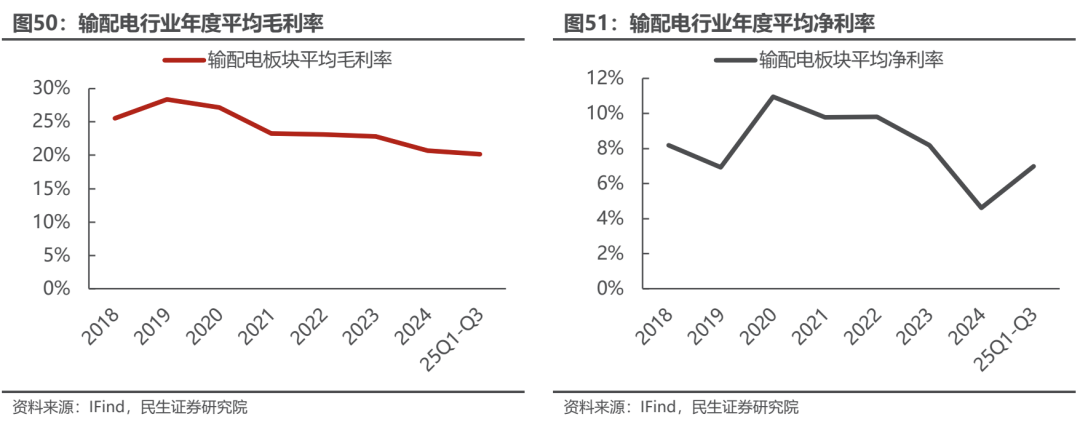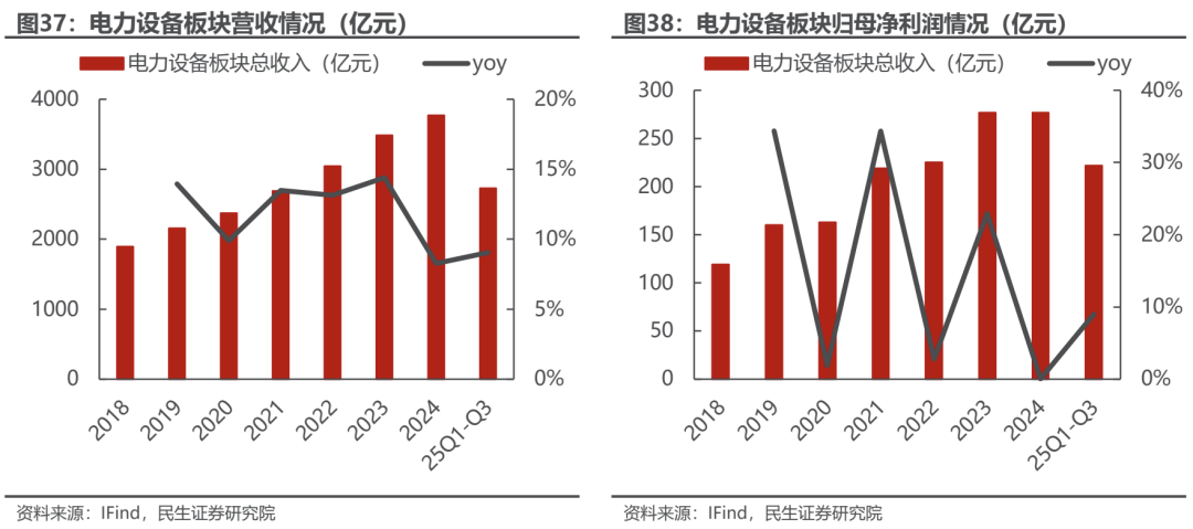 输配电设备行业业绩实现较快增长。输配电板块共有9家公司列入统计。2025年Q1-Q3行业共实现营收361.9亿元,同比增长20%;归母净利润实现36.5亿元,同比增长27%。25Q3实现收入133.1亿元,同比增长12%,实现归母净利润14.7亿元,同比增长30%。