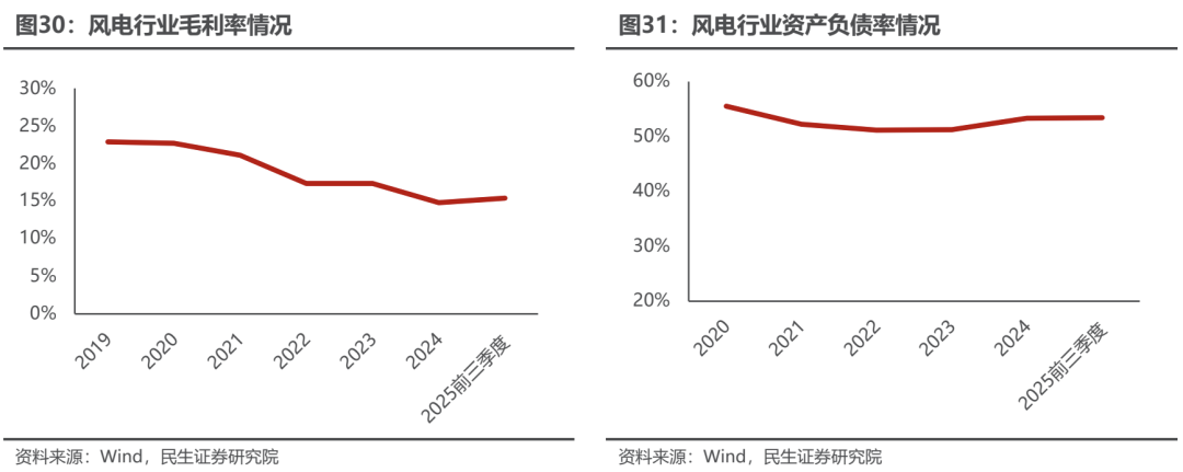 毛利率方面,风电行业2025前三季度算术平均法下毛利率约为15.41%,同比减少0.17pct;2025前三季度风电行业资产负债率约为53.40%、同比增长2.57pcts,呈持续增长态势。