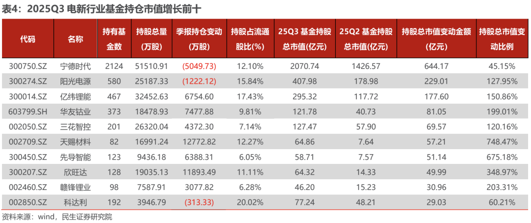 从持仓市值绝对值增长上看,宁德时代、阳光电源、亿纬锂能位列前三位,基金持股总市值增加金额分别为644.17/229.01/177.60亿元。截至25Q3,宁德时代与阳光电源的基金持仓股数环比小幅下滑,持仓市值的增长主要源于股价的上涨。