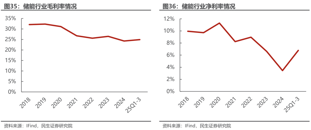 2025Q3储能行业毛利率和净利率环比改善。2025年前三季度储能行业毛利率为24.92%,同比下滑1.22pcts;净利率为6.78%,同比增加1.12pcts。2025Q3,储能行业毛利率为25.62%,同比下滑1.22pcts,环比增加1.48 pcts;净利率为7.24%,同比增加2.31pcts,环比增加0.25pcts。