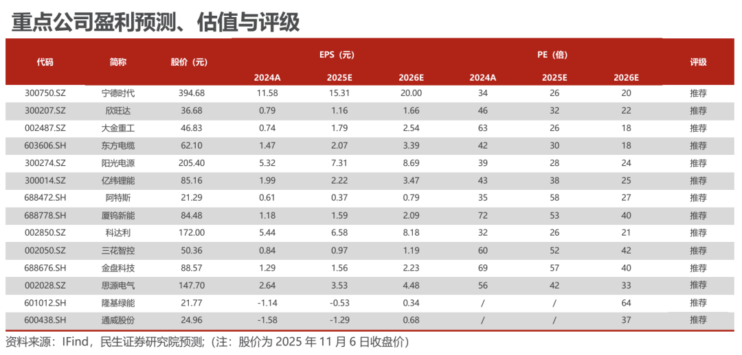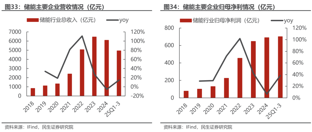 1)光伏:行业拐点已至。25Q1-Q3实现营业收入8534.74亿元,同比-11.41%,实现归母净利润-145.33亿元。分季度看25Q3实现营业收入2992.13亿元,同比-7.71%,环比-2.34%,实现归母净利润3.38亿元,环比看Q3板块整体实现扭亏为盈。主链大多数企业Q3实现减亏甚至利润转正,随着行业供给侧改革的持续推进,以及有关部门对无序价格竞争的加大管控,光伏行业有望迎来触底反弹。2)风电:营收净利双增。25Q1-Q3实现营收3641.34亿元,同比增长21.1%;实现归母净利润152.69亿元,同比增长22.3%。25Q3实现营业收入1360.16亿元,同比增长16.32%;实现归母净利润50.75亿元,同比增长37.37%。2025年三季度行业整体需求预期旺盛,营收净利实现同比双增,部分环节已经实现量利双增。3)储能:业绩维持增长,海内外需求共振。25Q1-Q3实现营收4,930.96亿元,同比增长14.61%;实现归母净利润701.87亿元,同比增长38.25%。25Q3实现营收1,789.27亿元,同比增长16.96%,环比增长4.70%;实现归母净利润276.75亿元,同比增长50.94%,环比增长20.80%。国内储能经济性凸显,海外AI高速发展背景下电力需求激增,海内外储能需求共振的背景下看好储能行业后续成长性。