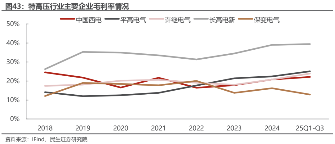 毛利率整体保持稳定。利润率方面,2025年Q1-Q3特高压行业平均毛利率24.67%,较去年同期增长0.88pcts。其中,长高电新、平高电气、许继电气等毛利率排名靠前,25年Q1-Q3毛利率分别为39.41%、25.09%、23.88%。
