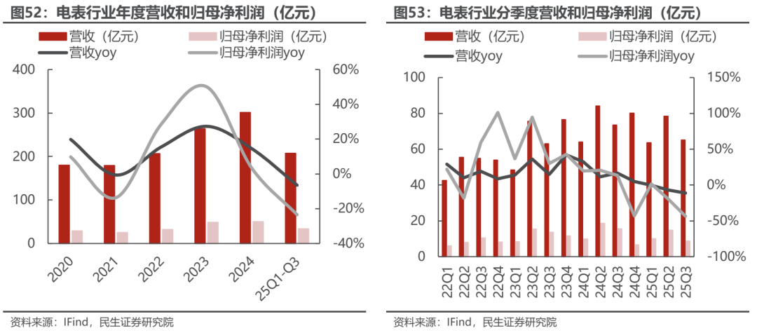 电表板块25年Q1-Q3业绩整体同比下滑。电表行业主要包括6家上市公司(迦南智能、海兴电力、安科瑞、三星医疗、炬华科技、林洋能源)。2025年Q1-Q3实现总营收207.2亿元,同比下降6%;归母净利润33.6亿元,同比下降23%。25Q3实现收入65.2亿元,归母净利润8.7亿元,同比有所下降。