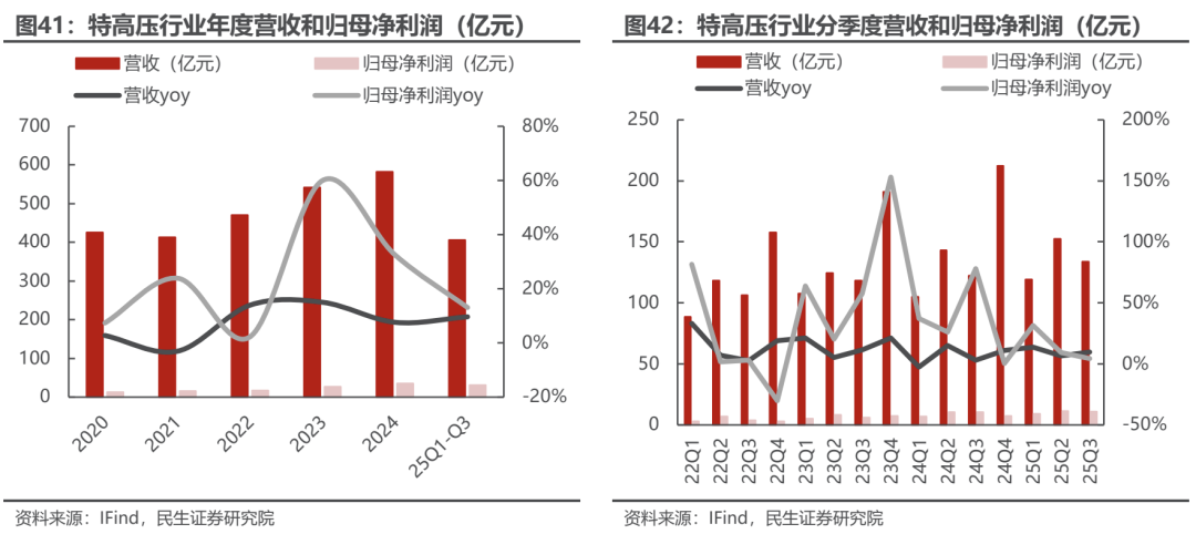 受益特高压建设进度加速,特高压板块业绩稳步增长。特高压行业主要包括5家上市公司(中国西电、平高电气、许继电气、长高集团、保变电气)。2025年Q1-Q3特高压板块实现总营收406.0亿元,同比增长10%;归母净利润31.7亿元,同比增长13%。25Q3持续保持增长,实现收入134.0亿,同比增长10%;实现归母净利润10.9亿元,同比增长5%。