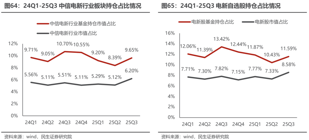 考虑到行业分类的一些误差,我们针对电新行业的306只自选股进行统计,结果显示截至2025Q3,306只电新自选股基金持仓占比为11.59%,环比+1.16Pcts,同比-1.83Pcts;电新自选股市值在A股总市值的比重为8.58%,环比+1.25Pcts,同比+0.76Pcts。