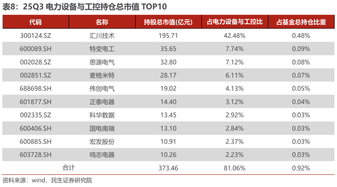 电力设备与工控:25Q3电力设备与工控持仓市值 TOP10标的中,汇川技术持仓市值达到195.71亿元,占基金总持仓市值的0.48%,占电力设备与工控持仓的42.48%,继续稳居电力设备与工控环节第一;特变电工持仓市值为35.65亿元,在总持仓中的占比达到0.09%,占电力设备与工控持仓的7.74%,位列第二;思源电气、麦格米特和伟创电气位列电力设备与工控环节基金持仓市值的3-5位,持仓市值位32.80/28.17/19.02亿元,在总持仓中的占比达到0.08%/0.07%/0.05%,占电力设备与工控持仓的7.12%/6.11%/4.13%。集中度方面,基金持仓市值前十位占电力设备与工控基金总持仓占比的81.06%,环比+1.37Pcts,占基金持仓总市值比重为0.92%,环比-0.06Pcts。
