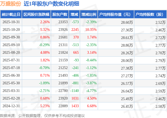 从股价来看,2025年10月20日至2025年10月31日,万盛股份区间涨幅为2.26%,在此期间股东户数减少573.0户,减幅为2.39%。