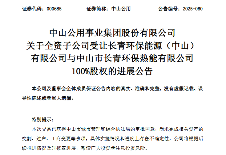 中山公用表示,将严格按批复推进付款、资产交割、工商变更登记等后续事宜,并及时披露进展。公司同时提示,交易尚未完成交割过户,实施进度仍存在不确定性,投资者需注意风险。