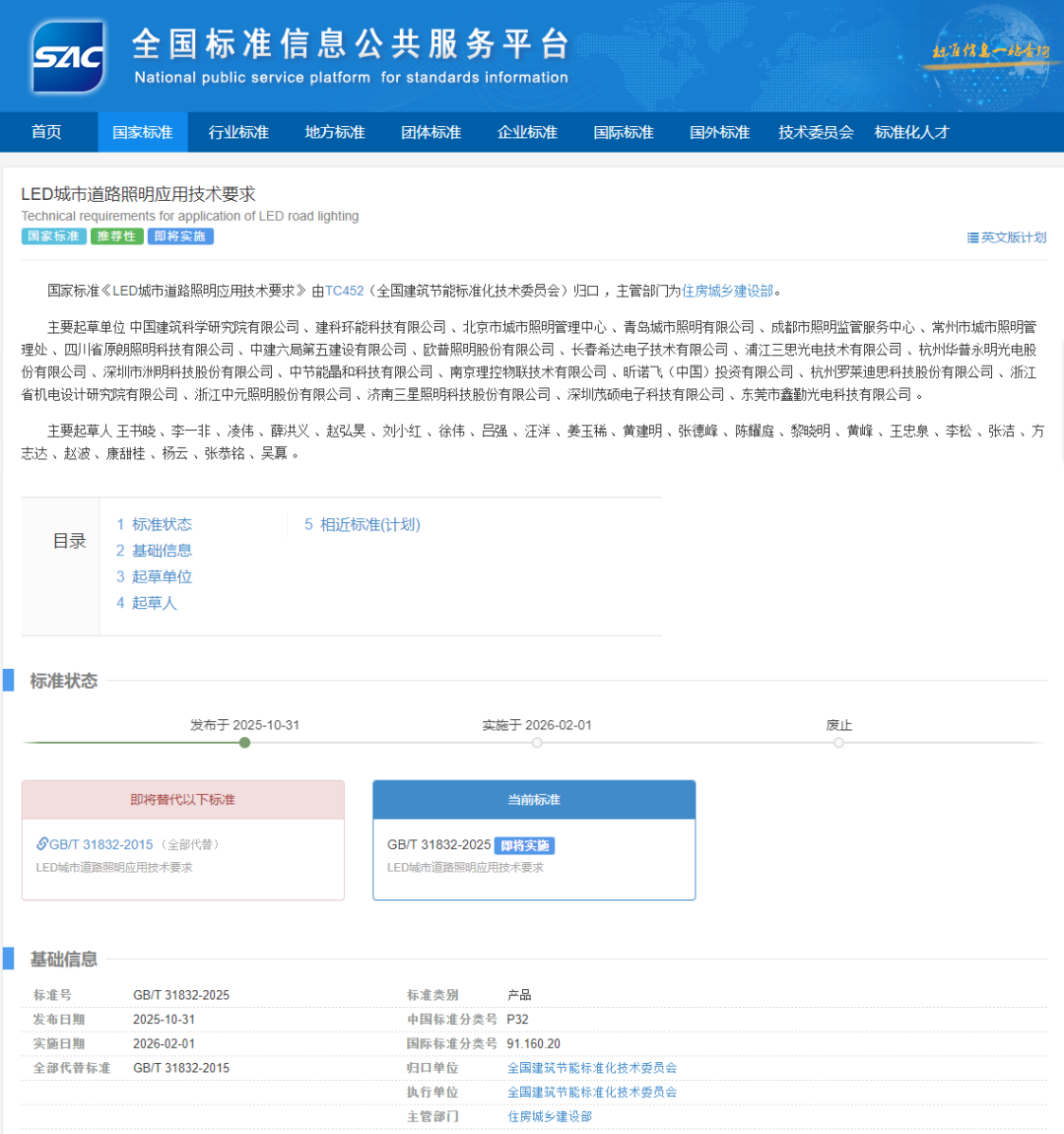 近日,由茂硕电源科技股份有限公司(简称:茂硕电源,股票代码:002660)全资子公司深圳茂硕电子科技有限公司(简称:茂硕电子)参与编制的国家标准《LED城市道路照明应用技术要求》(GB/T31832-2025)正式发布,将于2026年2月1日起实施。该标准由全国建筑节能标准化技术委员会(TC452)归口、中国建筑科学研究院有限公司主编,是对2015年版标准的全面升级,标志着我国LED道路照明行业迎来规范化发展新节点。