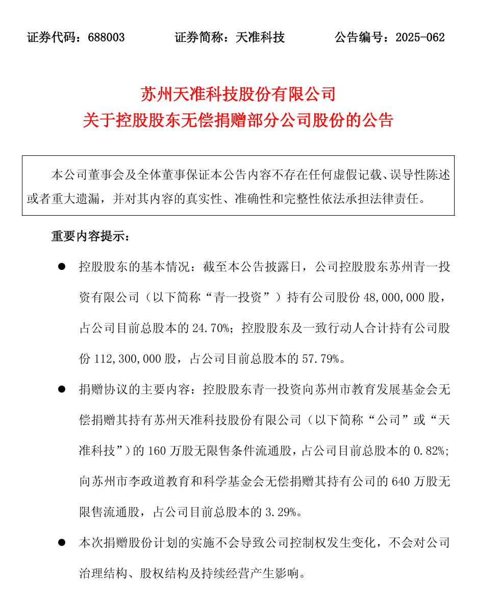 天准科技还表示,本次捐赠后,公司控股股东青一投资持有公司股份4000万股,占公司总股本的20.58%,仍为公司控股股东。本次捐赠不会导致公司控股股东、实际控制人发生变化,不会对公司治理结构及持续经营产生重大影响。