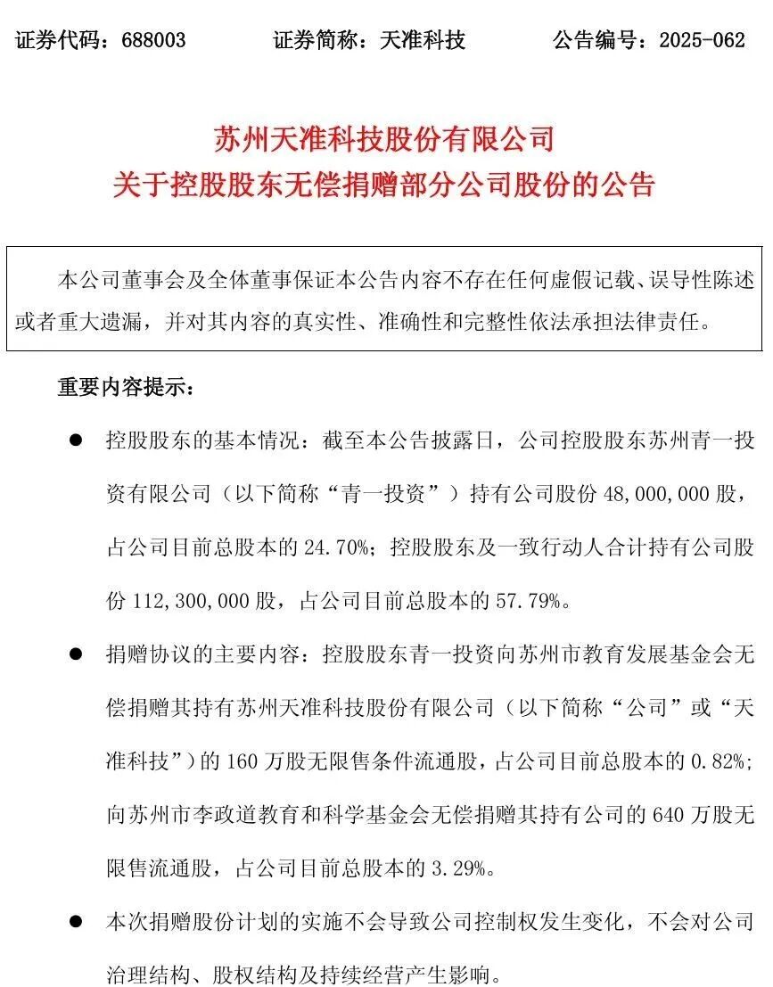 2025年11月9日,上交所科创板上市公司苏州天准科技股份有限公司(证券代码:688003、证券简称:天准科技)发布了《关于控股股东无偿捐赠部分公司股份的公告》。公告称,公司控股股东苏州青一投资有限公司于2025年11月8日与苏州市教育发展基金会和苏州市李政道教育和科学基金会签署了捐赠协议,决定无偿捐赠其持有的公司股份共计800万股。