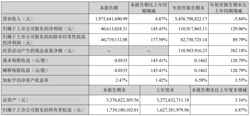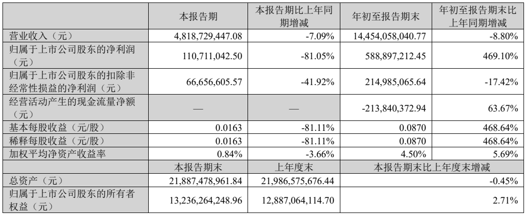 截至本报告期末,公司前三季度实现营收144.54亿元,同比下降8.80%;归母净利润5.89亿元,同比上升469.10%。第三季度营业总收入48.19亿元,同比下降7.09%,第三季度归母净利润1.11亿元,同比下降81.05%。