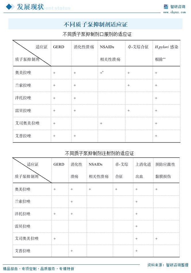 质子泵抑制剂可分为口服剂与注射剂。根据卫健委发布的《质子泵抑制剂临床应用指导原则(2020年版)》,不同质子泵抑制剂用于治疗各种酸相关性胃肠道疾病的适应证有所差异,具体如下图所示: