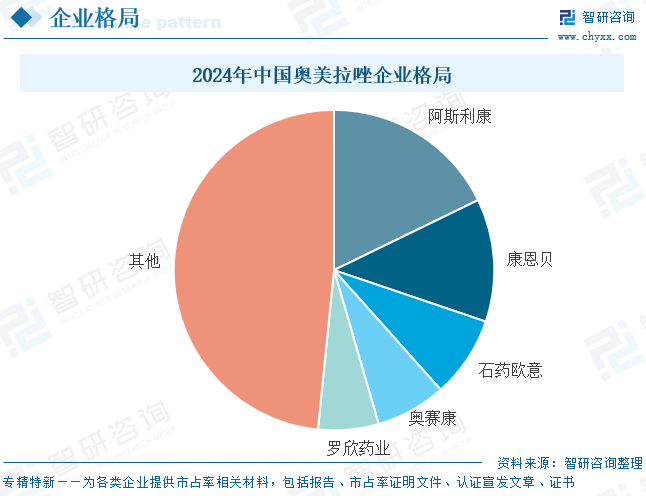 奥美拉唑原研专利过期后巨大的市场迎来了众多企业仿制,市场竞争激烈。2024年市场前五企业分别为阿斯利康、康恩贝、石药欧意、奥赛康、罗欣药业(维权)。其中,阿斯利康以17.8%的市场份额拔得头筹,康恩贝以12.4%的市场份额位居第二。