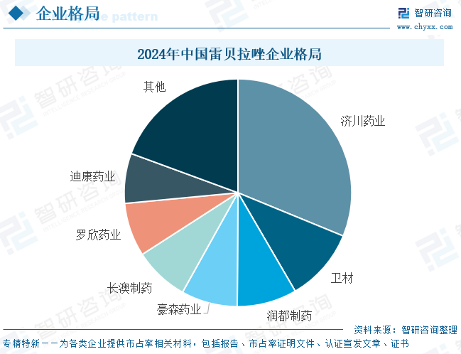 雷贝拉唑原研企业为卫材,雷贝拉唑与质子泵结合位点多,代谢为非酶代谢,具有起效更快、个体化差异较小、与其他药物联用时相互作用少等优势。目前,济川药业为国内雷贝拉唑领军企业,市场份额超30%,其胶囊剂市场规模最大,且具有绝对优势。其次为卫材,占比10%。