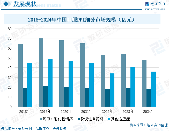 其中用于消化性溃疡的口服PPI规模为48亿元,消化性溃疡的发生是由于对胃十二指肠黏膜的侵袭因素与黏膜自身防御/修复因素之间失去平衡的结果。用于反流性食管炎的口服PPI规模为18亿元,反流性食管炎是胃、十二指肠内容物反流进入食管引起的食管炎性病变,是胃食管反流病的一种临床类型。用于其他症状的口服PPI规模为36亿元。