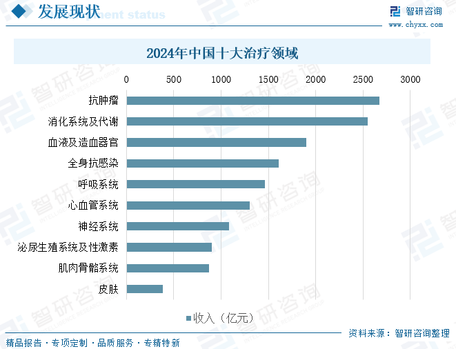 随着饮食结构多元化、外卖快餐普及及生活节奏加快,慢性胃炎、反流性食管炎、急性胰腺炎等消化系统疾病发病率逐年攀升,且患者年龄日趋年轻化。在此背景下,消化系统治疗需求不断增加。目前,抗肿瘤、消化系统及代谢是主导全球及中国医疗市场的两大治疗领域,2024年中国消化系统及代谢治疗收入规模为2550亿元,仅次于抗肿瘤治疗领域。