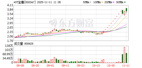 *ST宝鹰再度涨停,12个交易日内录得11个涨停,累计涨幅为62.66%,累计换手率为15.07%。截至9:25,该股今日成交量263.98万股,成交金额1034.80万元,换手率0.17%。最新A股总市值达59.44亿元,A股流通市值59.43亿元。