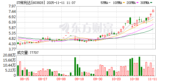 ST柯利达(维权)盘中涨停,已连收3个涨停板,截至9:58,该股报7.59元,换手率1.23%,成交量735.01万股,成交金额5519.04万元,涨停板封单金额为1477.92万元。连续涨停期间,该股累计上涨15.70%,累计换手率为5.03%。最新A股总市值达45.23亿元,A股流通市值45.23亿元。