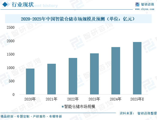 智能仓储作为现代供应链体系的核心组成部分,正通过技术驱动与政策引导实现跨越式发展。近年来,国家相继印发《关于推进移动物联网“万物智联”发展的通知》等一系列政策文件,明确将智能立体仓库、自动化分拣系统等纳入发展重点,为行业提供了坚实的制度保障与方向指引。在技术层面,物联网、大数据、人工智能等新一代信息技术深度融合,推动行业从集成系统阶段向智能自动化仓储阶段加速演进。数据显示:2020-2024年我国智能仓储行业市场规模由960亿元增加至1760.5亿元,年复合增长率达16.37%。预计,到2025年行业市场规模或将达到1954.1亿元,显示出强劲的发展势头与广阔前景。