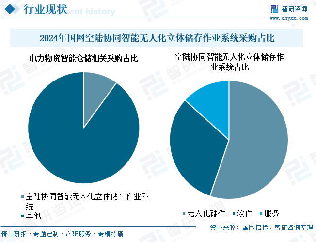 从采购结构分析,电力电网智能仓储的硬件主导型特征进一步强化。2024年国网招标中,空陆协同智能无人化立体储存作业系统占比达10.02%,标志着仓储场景向立体化、无人化深度演进。其中,无人化硬件(49.66%)、软件系统(28.35%)与服务支持(11.97%)形成“硬支撑+软赋能+服务延伸”的生态闭环。这一分布表明当前建设重点仍以硬件自动化为基础,同时软件平台与运营服务也在供应链中扮演越来越重要的角色。