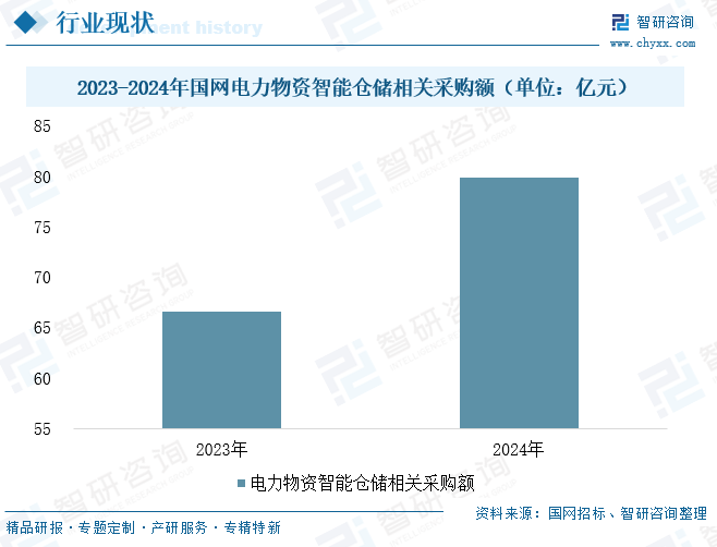 伴随电力行业对智能化转型的日益重视及相关项目的大规模推进,中国电力电网智能仓储市场呈现持续扩张态势。作为智能仓储领域的重要细分市场,电力电网智能仓储的发展节奏与行业整体保持同步,在行业共性红利的推动下,其市场规模稳步提升,已成为推动仓储领域智能化升级的关键力量。从国家电网的招标数据来看,2023年其智能仓储相关采购金额约为66.52亿元,至2024年已增至79.82亿元,同比增长20%,反映出显著的需求增长和市场活力。
