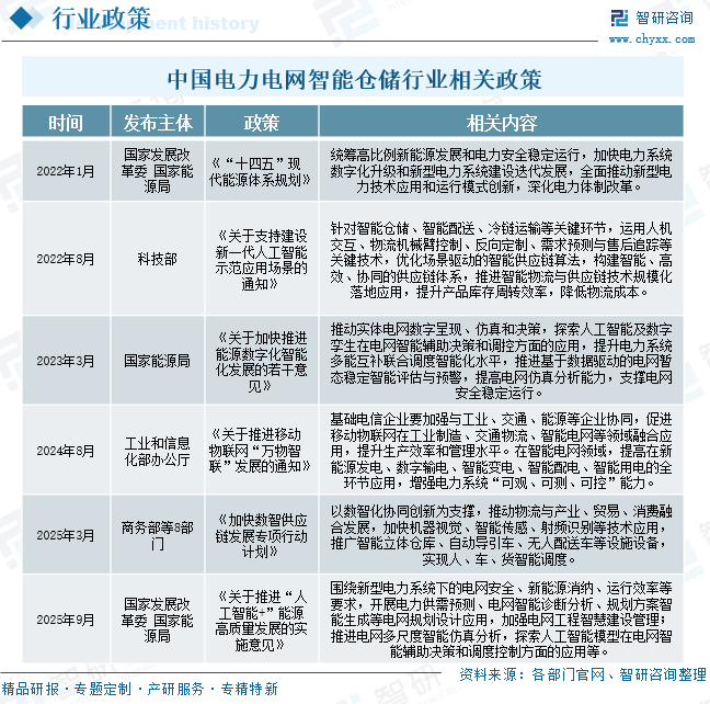 电力电网智能仓储是推动能源行业数字化转型与现代化供应链建设的关键环节。随着数字技术的不断发展与深度融合,我国密集出台了一系列具有前瞻性和系统性的支持政策。包括《“十四五”现代能源体系规划》《关于加快推进能源数字化智能化发展的若干意见》《加快数智供应链发展专项行动计划》等宏观战略,以及《关于支持建设新一代人工智能示范应用场景的通知》《关于推进移动物联网“万物智联”发展的通知》等具体举措。这些政策从顶层设计、技术应用、平台构建到生态培育等多个层面,为电力电网智能仓储行业提供了明确的政策指引与强大的发展动能,推动其向智能化、可视化、协同化方向高速演进。