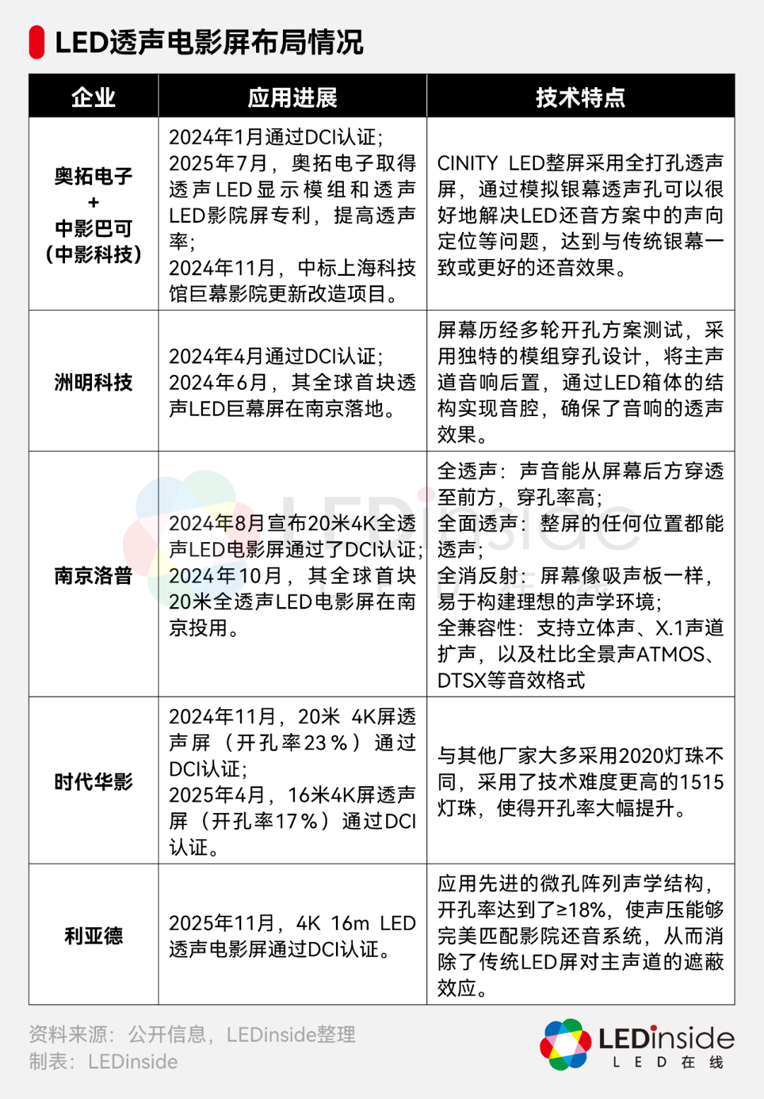 另值得关注的是LED电影屏透声技术。与传统银幕时代在后方布置音箱不同,LED电影屏不透声,这也成为其进入影院市场的主要障碍之一。不过,经过数年的研究,LED电影屏透声技术逐渐取得突破。目前,中影科技、洲明科技、南京洛普、时代华影以及利亚德等厂商已在透声屏领域开花结果。总体而言,目前LED透声技术主要采用微孔穿透式设计,在LED模组或灯板上精密布置微米级透声孔,实现全面透声,确保音响效果。