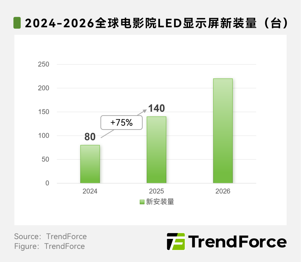 根据TrendForce集邦咨询《全球LED显示屏市场展望与价格成本分析》报告(了解报告>)预估,2025年全球LED电影屏的安装数量预计可达140台,年增75%。结合硬件商与方案商的布局态度与发展进度来看,LED电影屏的产值有望保持高速成长。尽管规模仍较小,但2025年电影院LED显示屏的市场规模有望成长至3,600万美金,年增60%。