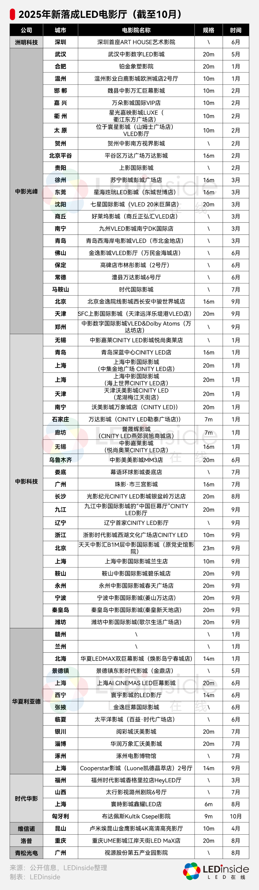譬如,2024年5月,国家发展改革委等六部门印发《推动文化和旅游领域设备更新实施方案》,推进电影放映技术自主创新,启动大规模实施影院LED屏放映系统更新计划。在此背景下,2024年电影屏安装数量迎来高峰。根据TrendForce集邦咨询数据显示,2024年中国市场电影屏安装量高速成长,推动全球安装量达到80台,其中,中国市场占比约8成。这一快速成长的态势持续延续到今年,据LEDinside不完全统计,截至10月,2025年落地的LED电影屏数量已超70。